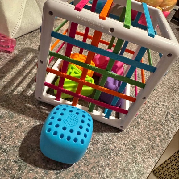 5 chunky, uniquely textured shapes fit through the elastic bands of the cube