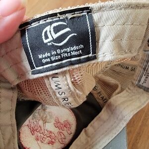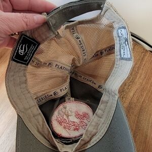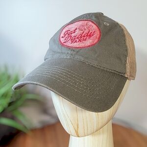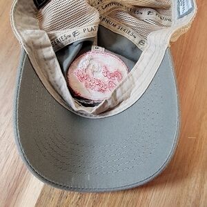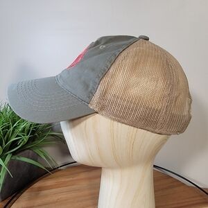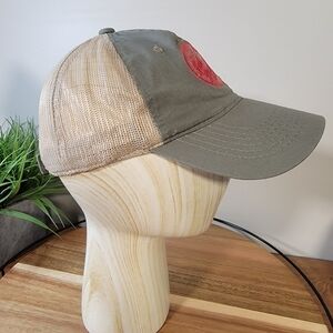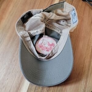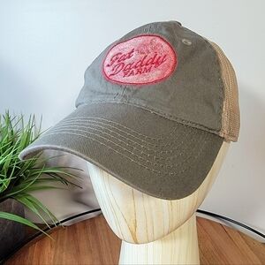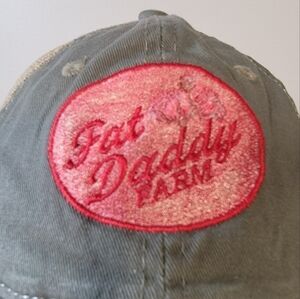 Fat Daddy Farm logo patch ball cap. Green ( gray / green ) front. tan mesh back. Hook and loop back adjustable closure. Reddish embroidered logo patch.