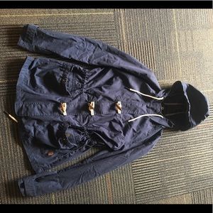 Waterproof rain jacket in a dark blue color. Since waist with two exterior pockets. Rope accents make this coat super cute. This is a light jacket with no lining but it is waterproof and a good raincoat. I love it but I just live in too cold a climate for it. UK size 12, US size 10 but I’m a size 4/6 and this is perfect.