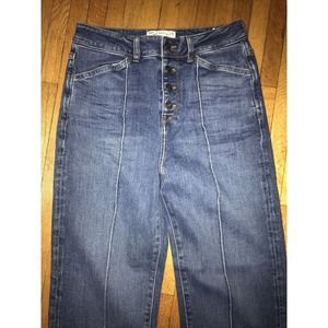 Fat Face UK Eco Denim solid darker blue denim wash cotton blend Elise Wide Leg high rise jeans. Features flat front and high rise with medium width waist band and belt loops. Diagonally set front hip pockets. Subtle embroidery detail on open style back pockets. Visible 4 logo metal button closure. Vertical seaming down center front of wide leg length. Falls to full length. Traditional denim weight fabric with stretch available. Woman’s size 6L with 28” unstretched waist measurement, 35” hips, 12” rise and 32” inseam. EUC. Worn a few times. Recently cleaned and spotless