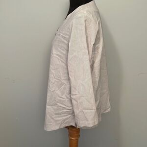 Perfect as an over shirt, a dress-up shirt, an everyday-everywhere kind of shirt. These delicate pinstripes and glassy geometric beads make this the perfect shirt for a summer night. If it’s an arty yet neutral and unusual top you’re looking for, look no further. This one has it all: curved V neck, ¾ length sleeves, front buttons, and angles.