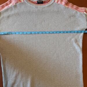 Fate long sleeve crew neck top in light gray and beige waffle knit fabric. Size Large with measurements in photos. Relaxed fit with subtle hi-low hem. Dolman sleeves with cut out crochet detailing. Shoulder and outer sleeves feature vibrant geometric panels in shades of pink, orange, and white for a bohemian, tribal-inspired aesthetic. 100 percent cotton. Comfortable casual style with unique patterning and textured waffle knit. Perfect for layering, festival looks, casual outings, or boho chic styling.