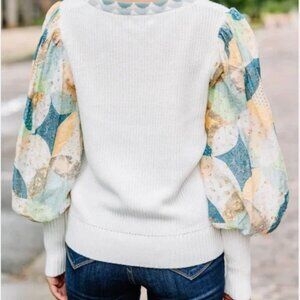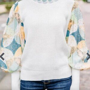 Stylish white sweater featuring colorful, patterned puff sleeves. Perfect for a chic look. We just can't let you go without making absolutely sure that you have seen this sweater! Just look at it! Those printed bubble sleeves are just so much fun! We also love that scalloped print around the neckline! This sweater is going to look fab with jeans this fall! This sweater features a round neckline, long bubble sleeves with an abstract patchwork pattern.