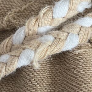 Fate French Terry Cotton Raw Edge Jogger Pants in Tan - Size Medium. Good pre-owned condition. A few strings have pulled a little bit loose on the braided drawcord tie, shown in pic. Measures a bit small in the waist for the tagged size, in my opinion. Please refer to measurements provided to ensure fit. 100% cotton french terry, elastic waist with outer drawcord tie, tie is braided, elastic at ankles, raw edges. Approximate measurements: 14 1/2" elastic waist, 11" rise, 28" inseam.