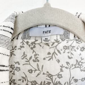 Fate cropped patchwork-style jacket in black and white with mixed vertical stripe pattern and button front. Fully lined in contrasting floral print. Made from a linen-viscose blend with cotton lining. Size Medium. Excellent condition. No visible flaws. See all photos.