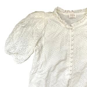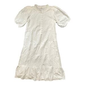 This playful eyelet dress features short sleeves, a drop waist hem, and a button front for a flirty touch. The slight v neckline and relaxed fit add effortless charm to this must-have midi.