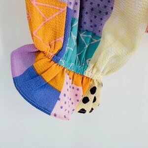 Fate Multicolor Abstract Patchwork Long Puff Sleeve Ruffle Keyhole Blouse Size S