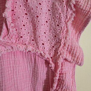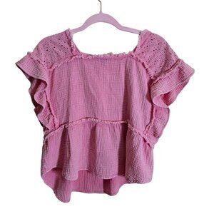 Charming pink peasant top by Fate, showcasing a square neckline, eyelet lace detailing, and raw hem finish. Constructed from soft slub cotton, this shirt has ruffled sleeves and a cropped fit. Ideal for casual outings or summer picnics. Size S.
