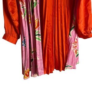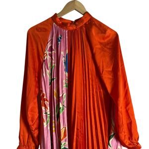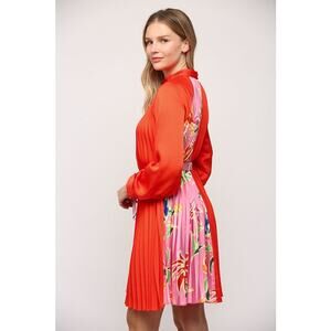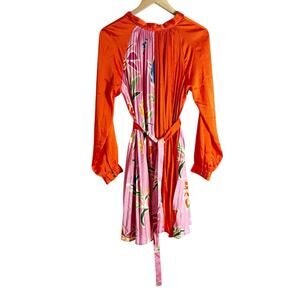 Fate Red Pink Floral Print Pleated Satin Long Sleeve Belted Mini Dress Size S