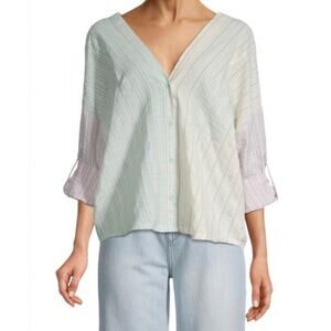 Fate Small S Yellow Green Pink Striped Button Down Shirt Patchwork V Neck V Back