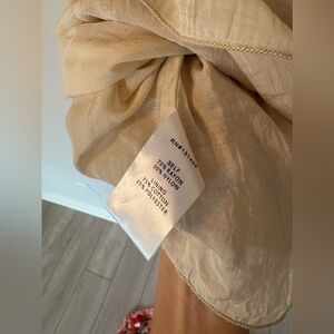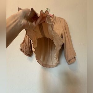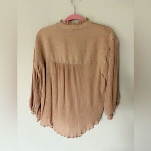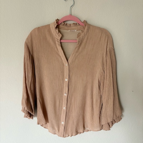 Chic tan blouse with ruffle details. Features button-up front. Ideal for versatile styling.