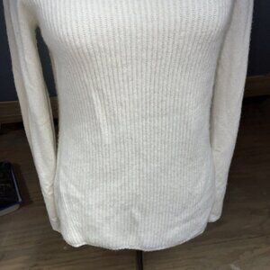 This is a Fate brand ivory sweater in size M for women. It is a regular fit, pullover style made from a cozy cashmere blend material. The sweater features a stylish ribbed design with cut out details and a choker neckline, making it both comfy and soft. Ideal for casual or business occasions during the winter season.