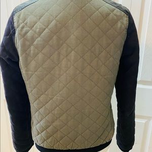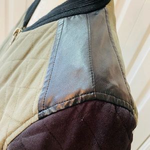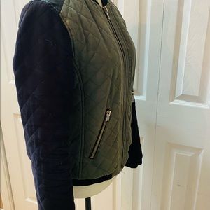 Fate green/black quilted denim. Bomber jacket. Black faux leather on the shoulders and gold zippers and buttons.