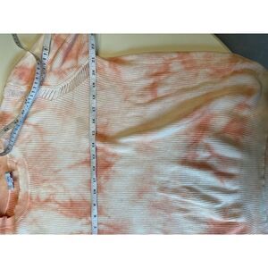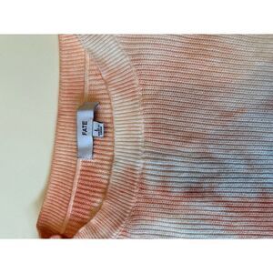 This is a pre-owned Fate tie-dye sweater in size L. It is a white and peach color with a ribbed texture. The sweater has a round neckline and long sleeves. There are intentional slits on the shoulders. The sweater is made of a soft, lightweight material. The measurements are: 17 inches across the chest, 24 inches in length, and 24 inches in sleeve length. The sweater is in good condition with no visible stains or tears. The sweater is a great option for casual wear.