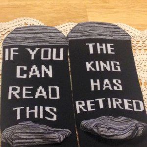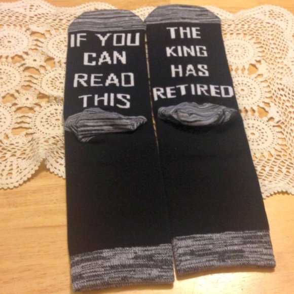 If you can read this, the king has retired. Cool gift idea for a man who is retiring, a birthday gift for Dad or a Father's Day gift or gag gift stocking stuffer. Pair with golfing, fishing or hunting accessories or with his favorite snacks or beverages. Please check measurements. This material has at least a 1 inch stretch, maybe a little more. Check against existing sock if unsure of fit.