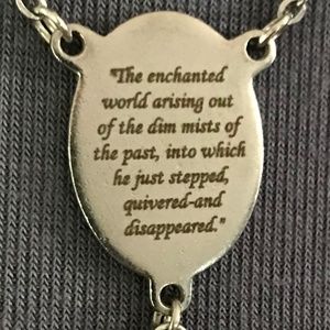This unisex necklace features (from left to right), first, a stethoscope charm, for nihilistic Bazarov's faith in natural science and his army doctor father. Next is a book charm, for Nikolai's fondness for poetry. Then comes a flowers charm, for the flowers that decorate Bazarov's grave, symbolizing the eternal profundity life has that goes beyond science. In the center, a book cover pendant dangles from a connector with the engraving "The enchanted world arising out of the dim mists of the past, into which he just stepped, quivered-and disappeared.” To the right is a charm of a barn, for the farm Bazarov's parents own. Next is a tree charm, for the wonder of nature and the tranquility it inspires. Last is a gravestone charm, for the inscription on Bazarov's grave. This necklace has been newly handmade, and is adjustable from 18 to 27 inches (can be altered upon request).