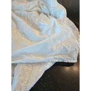 has silky white ribbon lacing thru parts, has embroidered and crocheted parts as well.