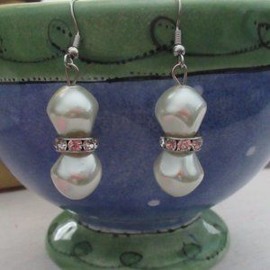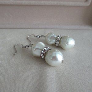 Faux Baroque Twin Pearl Dangle Drop EARRINGS with Rhinestones ring, in silver tone. Beautifully crafted.