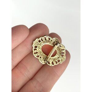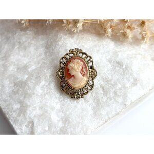 Gorgeous gold toned oval shaped cameo brooch. The brooch has a textured cutout frame with faux cameo shell. It features a left facing profile. Enclosure works horizontally. there are tiny little pearls on the front, faux. there are two little pearls missing.