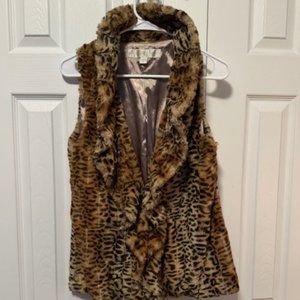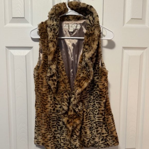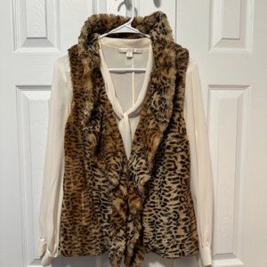 Dress up or dress 'down' this fun 'teddy' vest with faux fur ruffle feature in front. This size 6 vest works for petite sizes. Two hidden hook and eye closures. Like new. Ivory blouse and red sweater were added to assist in visualizing how the vest is worn. Ivory blouse and red sweater not included in price