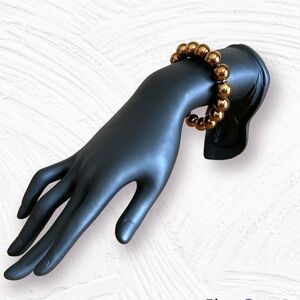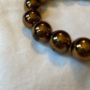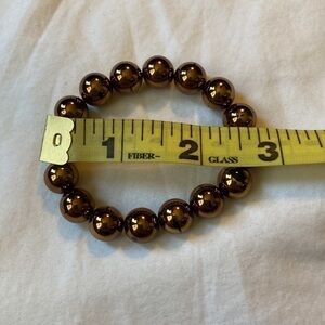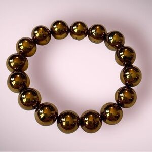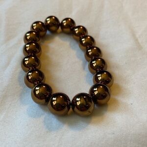 Shiny copper/brown colored beaded bracelet with elastic band for easy on and off. This is a great layering piece with other bracelets to provide a different texture or material and offer some shine to your bracelet look.