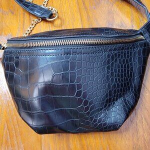 🐊 Faux Croc Belt Bag Crossbody – Black Glossy PVC with Gold Chain Detail | Unbranded | Excellent Condition