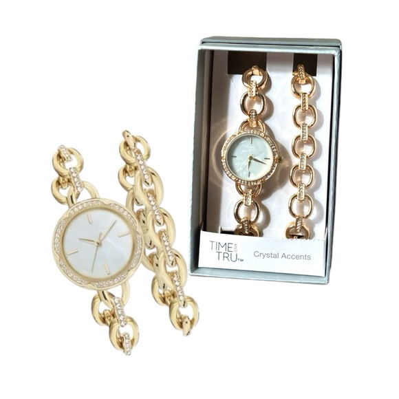 NWT Time And Tru Gold Tone Faux Crystal Bezel Watch And Bracelet
