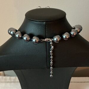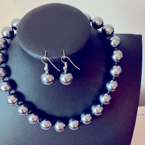 Elevate your style with this sophisticated Imitation dark gray pearl necklace and earring set. Large 8mm beads and their luster make them a nice addition for the pearl lover. The beads are hand knotted.