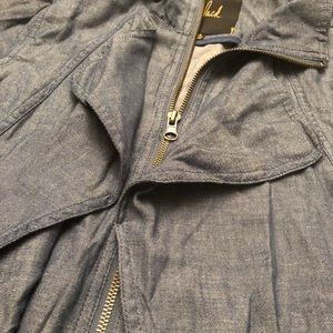 Denim colored jacket, not actual denim fabric. The fabric is lightweight cotton, but denim color and structure.