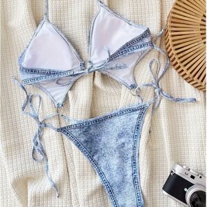 Faux Denim Print Cut Out Halter Sexy Monokini Backless One-piece Swimsuit. Perfect for you beach vacation or cruise! This sexy denim look fabric and monokini style will draw the attention of those around you! This is a women's size Large Fits: Size 8/10 Bust:37.4-39.8 Waist: 29.6-31.9 Hips:39.4-41.8 Height:5'9"-5'11"