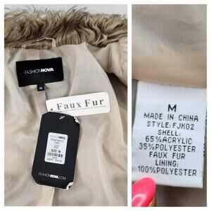 New with tags gorgeous faux fur somewhat bomber style jacket by Fashion Nova in a womens medium. In excellent condition overall with the exception of a couple small marks / scuffs on the fabric on the inside pointed to in photos.