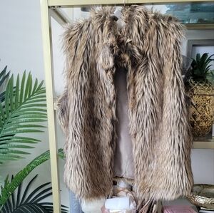 Pre-owned stylish brown faux fur vest in excellent condition! Sleeveless. Barely worn! Fur is soft! 0 is lined! Acrylic and polyester blend. Lined with 100% polyester. Has a Mixture of cream/dark and light brown furs. Cozy and warm.
