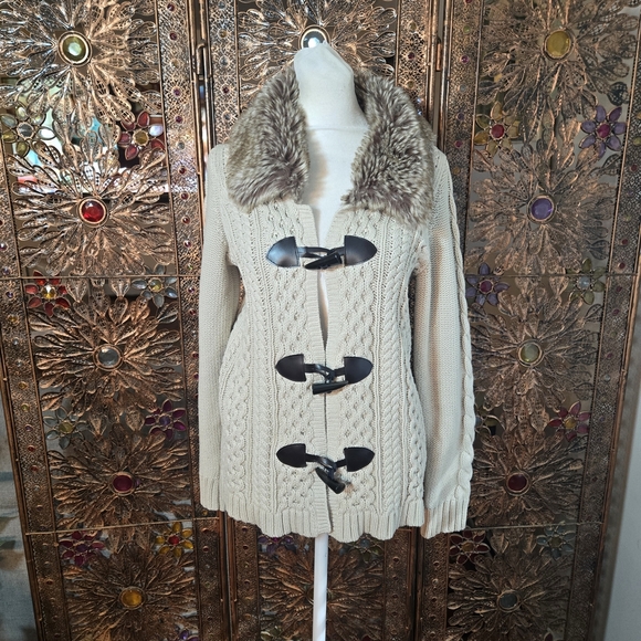 Faux Fur Collar Toggle Cable Knit Cardigan Sweater Jacket Womens Cream Tan Small