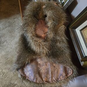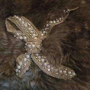 Keep your dog stylish with this elegant faux fur jacket. It features a rich brown color and a charming bow with pearl and rhinestone buttons. It's perfect for any occasion.