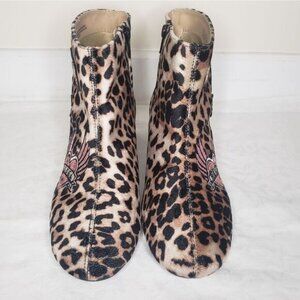Soft tan black faux fur leopard print ankle boots with fun patches and black block heels, by Place.