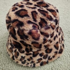 Faux Fur Leopard Print Adjustable Bucket Hat Women