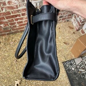 Textured leopard print tote bag with sleek black accents and handles.