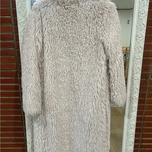 Luxurious faux fur long coat in a soft cream color. Perfect for adding elegance to any outfit.