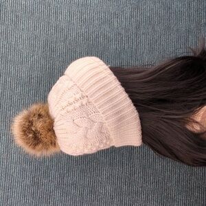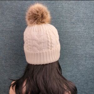 It is cream off white, and the pom pom is brown faux fur that looks very real.