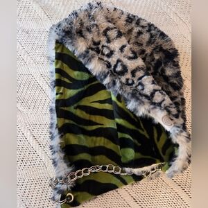 reversible hood with chain, worn maybe twice. I have too many hoods! perfect condition, super soft. from Elephant Tribe. more pics to come of actual hood in my possession. thanks for wandering into my closet and looking around!
