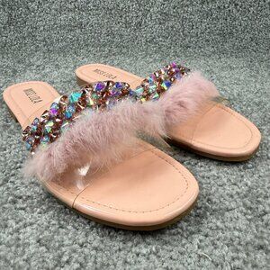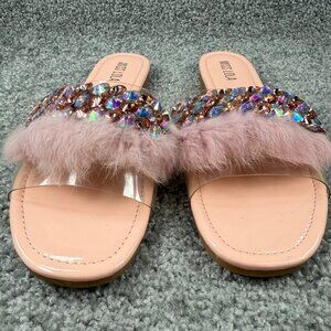 Faux Fur & Rhinestone Embellished Pink Slide Sandals Miss Lola Size 9 Slip On