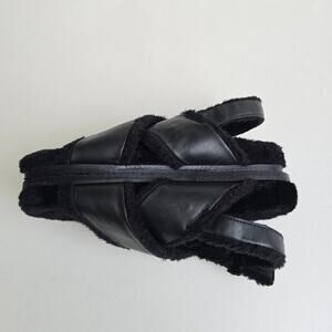 Black leather upper in a criss-cross design, open toe, slingback strap w/ adjustable buckle. Fully lined in soft fuzzy faux sherpa fur. Flat sole. Issues noted in photos. Excellent preowned condition, overall. Size 7 by Seychelles. Style: No such thing.