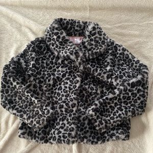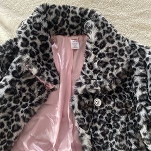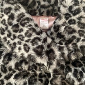 Cheetah print faux fur shell jacket, one button at the top, pink interior