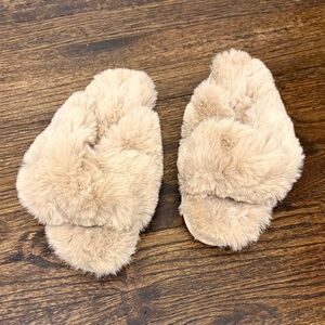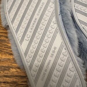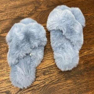 Super soft and cozy, slip into comfort with this fun set of 2 solid faux-fur slippers. Beige pair is from LOFT, Size: S (5-6). Blue pair is LC Lauren Conrad, Size: XS (5-6).