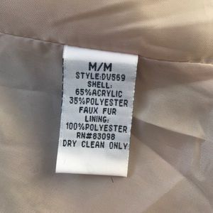 Shell is 65% acrylic faux fur, 35% polyester and the lining is 100% polyester