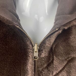 Additional Details: Fluffy and warm faux fur body that is reversible to a sweatshirt material on the other side, zip front, hooded, fully functional pockets when worn either way. Nice substantial weight to this piece.