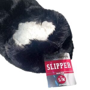 NWT Cozy faux Sherpa-lined slippers, black faux fur exterior and non-slip silicone soles. Pull-on style with elastic secured upper. Perfect new condition!