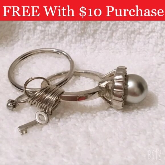 This is a really classy key chain. It is a huge, faux grey pearl, surrounded by rhinestones. There are already 2 charms on the key chain, with room to add 4 more. It is set in silver tone rhodium plate. Great gift for a friend or for Mother's Day. It measures just over 3" long, including the key ring.