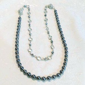 This lovely necklace is actually comprised of two different necklaces that can be worn separately or attached together with their rhinestone studded magnetic clasps. One of the necklaces is done in black faux pearls with silver tone spacers and the other one is done in bezel set clear crystals. Each piece measures 18" in length. In beautiful condition!