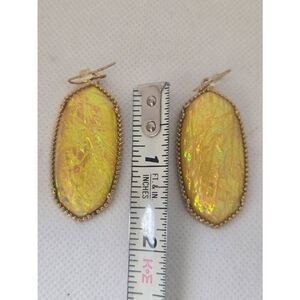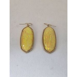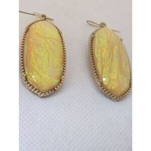 Add a touch of elegance to your outfit with these Faux Ivory Opal Hex Gold Tone Drop Earringstunning Faux Ivory Opal Hex Gold Tone Drop Earrings. The beautiful hexagon shape and yellow main stone color make these earrings a perfect choice for any occasion. The earrings are 1.75 inches long and have a hook closure for easy wear.